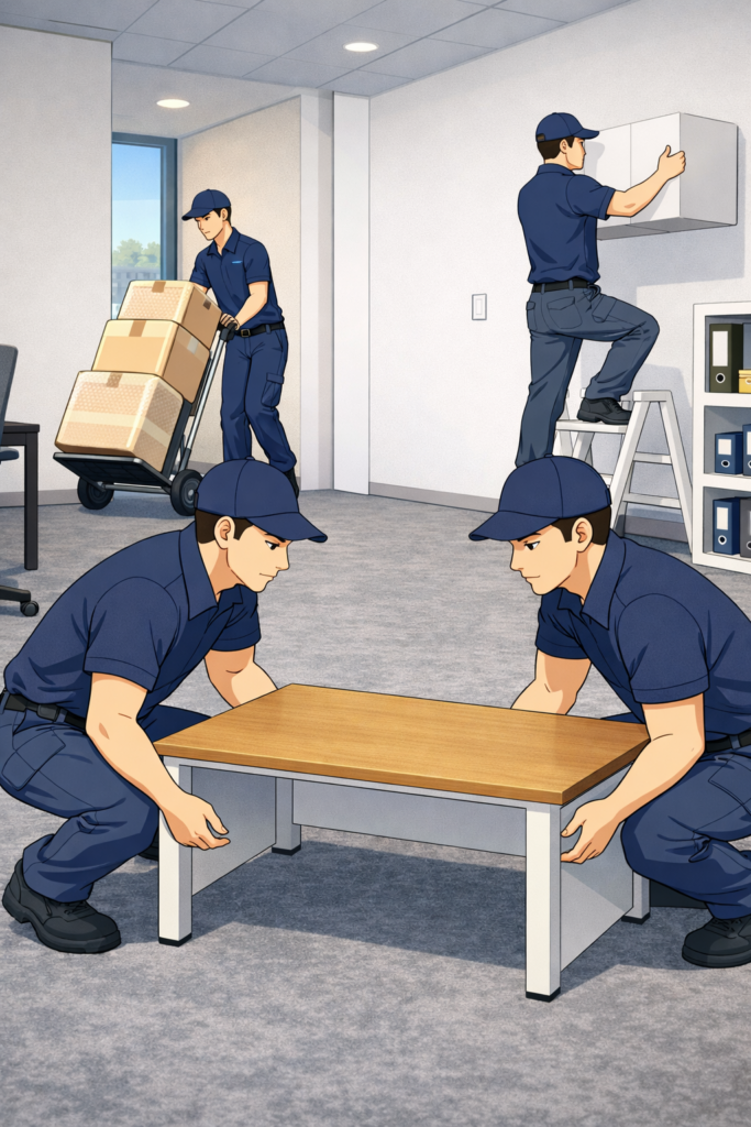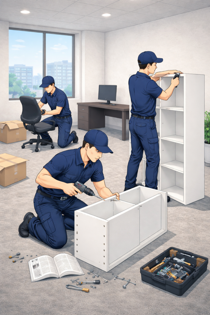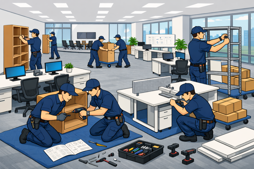 オフィス家具や木製棚、スチール棚などの組み立てを専門スタッフが対応